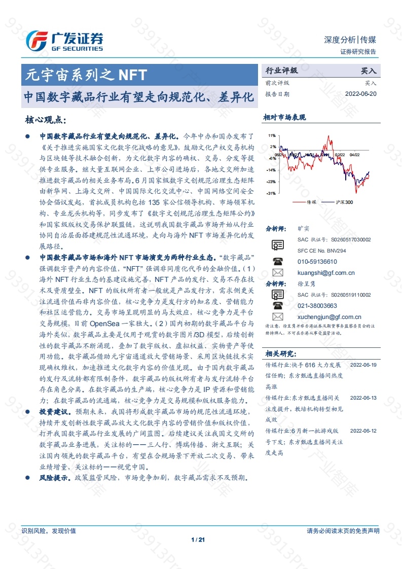 首页产业报告元宇宙传媒元宇宙系列之NFT:中国数字藏品行业有望走向规范化、差异化